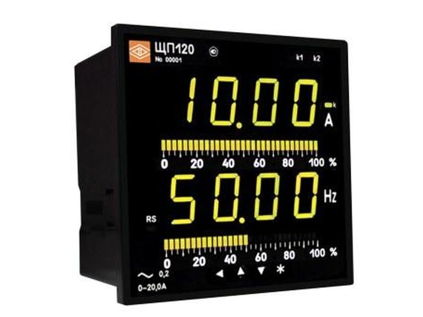 Прибор ЩП120, основной индикатор – диапазон измерений входного сигнала от 0 до 500 В, дополнительный индикатор – диапазон измерений частоты от 100 до 850 Гц, напряжение питания от 85 до 264 В переменного тока частотой 50 Гц или от 100 до 370 В постоянного тока, два интерфейса RS485, два аналоговых выхода 0…5 мА и 0…20 мА, два дискретных выхода, цветной комбинированный индикатор, класс точности 0,5, эксплуатация на АЭС, с двумя дополнительными барграфическими (дискретно-аналоговыми) шкалами