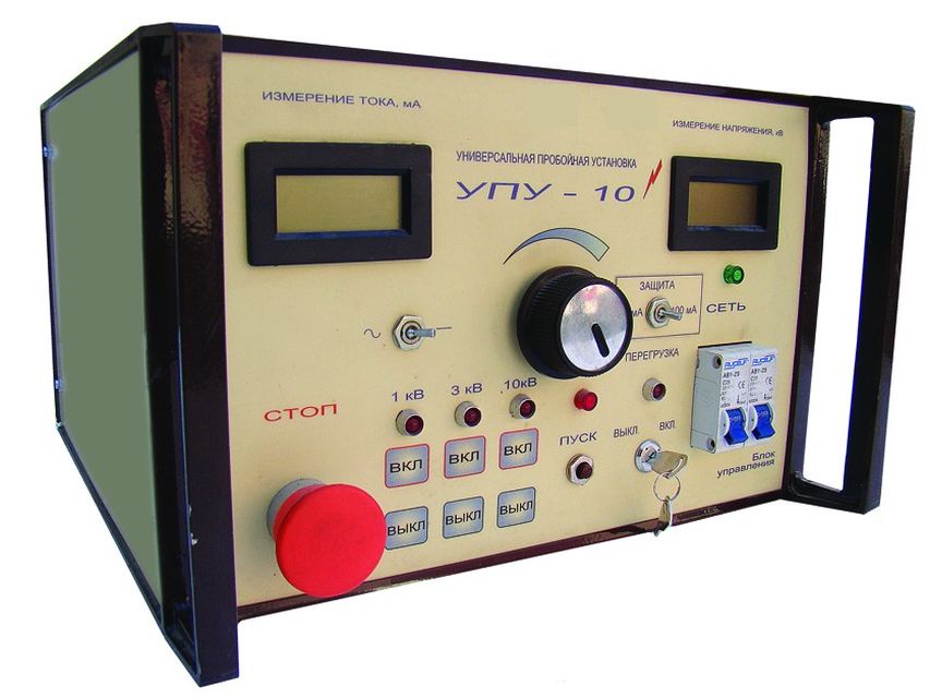 Установка пробойная универсальная УПУ-10М  предназначена для испытания изоляции электротехнического оборудования и материалов  переменным синусоидальным напряжением частотой 50 Гц и выпрямленным напряжением отрицательной полярности, регулируемым в пределах  0-10 кВ с выходным током до 100 мА.