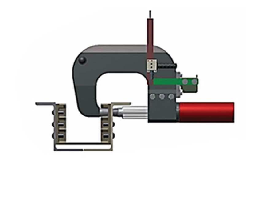 Гидравлическая скоба для клепки пятника вагонов-хопперов, ном. давл. 63 Мпа, 40тс, макс. Ø заклепки, тип клепки: холодная 14 мм, горячая 25 мм (комплект пуансон-матрица 25 мм по заказу); глубина зева до оси 190мм, ширина зева 145мм, гидравлический возврат. Опция: насосная станция, комплект РВД.