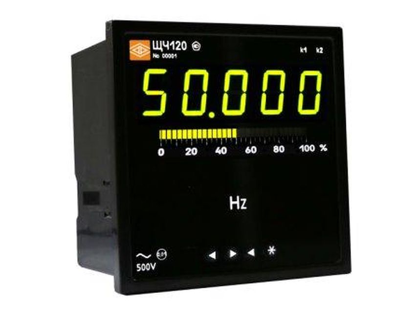 Прибор ЩЧ120, входное напряжение 500 В, напряжение питания от 85 до 264 В переменного тока частотой 50 Гц, два интерфейса, два аналоговых выхода 4…20 мА, 0…5 мА, два дискретных выхода, цветные комбинированные индикаторы, разрядность 5,0, наличие барграфической шкалы
